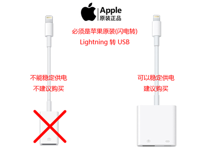 因此,必须购买正品的苹果转接头,而正品转接头中,又需要购买有外接电源插口的款,如下图所示